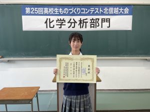 福井県代表として参加した化学創造科3年の加藤さんは10名中第2位の優秀賞を獲得しました。