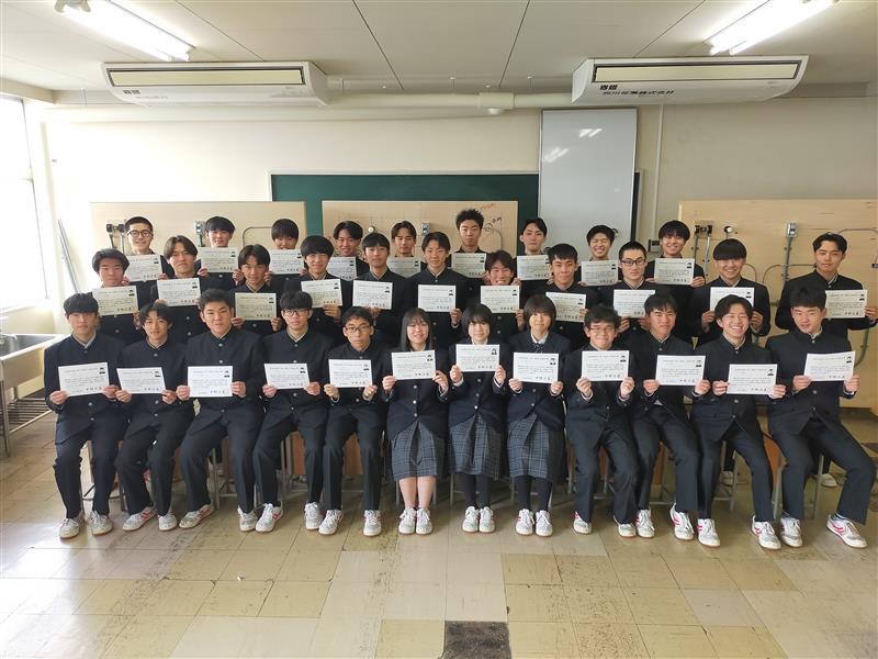 電気工事会社の営業所や工事現場の管理者に必要な国家検定(2級電気工事施工管理技術検定)の第一次試験に前期で33名が合格しました。高校総体など部活動も忙しい中でクラス一丸となって頑張り、一次検定受検者全体の合格率が6割程度のところ、本校は9割を超えました。