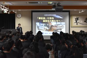 高P連主催の講演会を開催し、3年生が受講しました。講師には株式会社IS保険企画の下村挙史様をお迎えし、「車社会に出る高校生の君たちへ」をテーマにご講演いただきました。