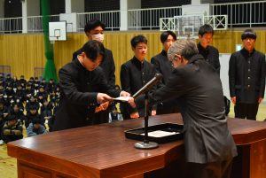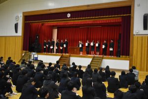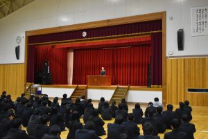 3学期は各学年最後の学期となります。校長先生は、生徒たちがお互いに支え合いながら、様々な困難を乗り越え、一人の人間として強くたくましく成長していくことへの期待を述べ、式辞を結ばれました。