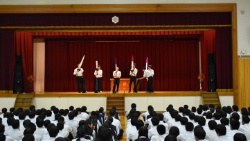 学校行事 2024.7.8 学校祭色決め 2024.7.8 学校祭色決め学校祭の色決めを行いました。生徒会が色のついた大きな「剣」を作り、全校生徒が見守る中、総団長がその剣を引き抜くかたちで各組の色が決定しました。白組・・・・・3-1,3-4,2-2,2-3,1-5青組・・・・・3... 2024.07.11 学校行事